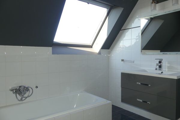 Op de dakverdieping bevinden zich de grote nachthal, 2 volwaardige slaapkamers, een berging met de voorziening van was- en droogmachine, apart toilet en de badkamer met ligbad en enkele lavabo in meubel.