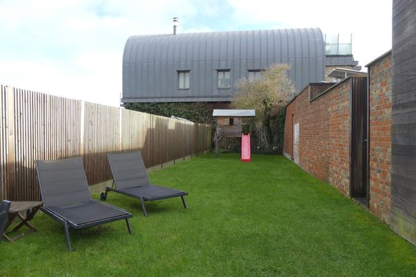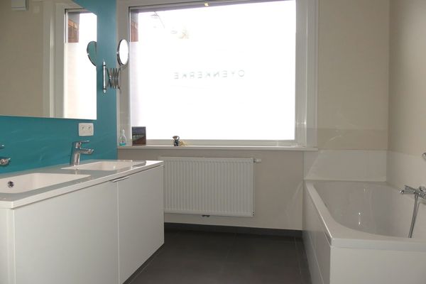 De indeling is als volgt: inkomhal met toegang tot de kelder, een apart gastentoilet, wasplaats en badkamer. De ruime badkamer is uitgerust met een ligbad, inloopdouche en dubbele lavabo. Achteraan bevindt zich de lichtrijke leefruimte met open, volledig ingerichte keuken. Het imposante schuifraam zorgt voor een overvloed aan natuurlijk licht en biedt zicht op de aangename, onderhoudsvriendelijke tuin met ruim terras — ideaal om te genieten van zonnige dagen.