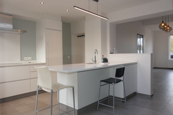 Ingericht met inductiekookplaat, dampkap, vaatwas, oven, koelkast, dubbele spoelbak, aansluiting was-droogmachine
