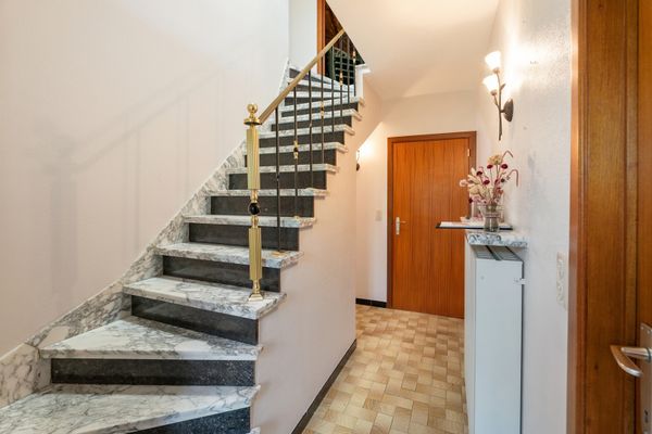 Men komt de woning binnen via de inkomhall met apart gastentoilet, deze verleent toegang tot de verscheidene leef- en slaapruimtes alsook tot de garage.